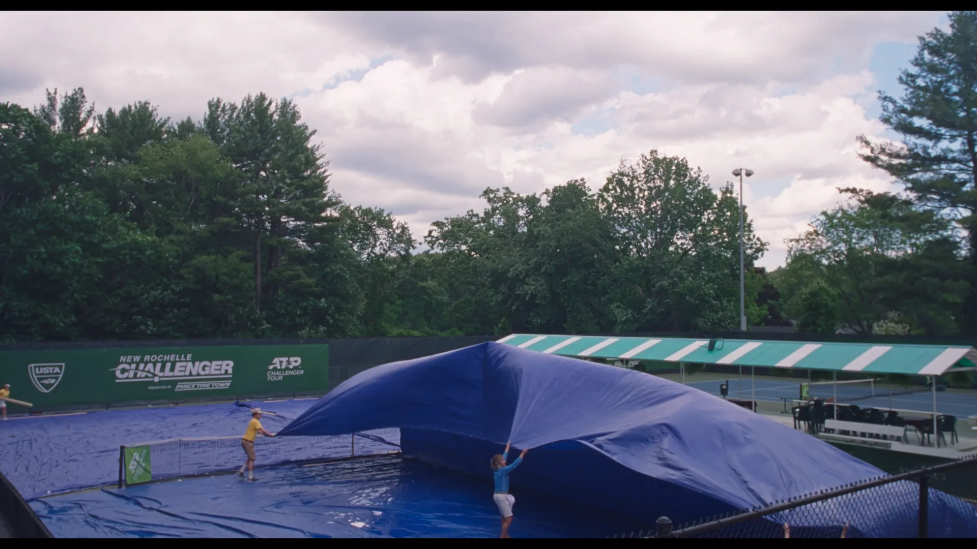 In other scenes, the vegetation around the tennis courts was enhanced and digitally extended to align the background with the setting. Trees and plants were added in every camera-visible direction, creating a fully immersive 360° natural environment.
