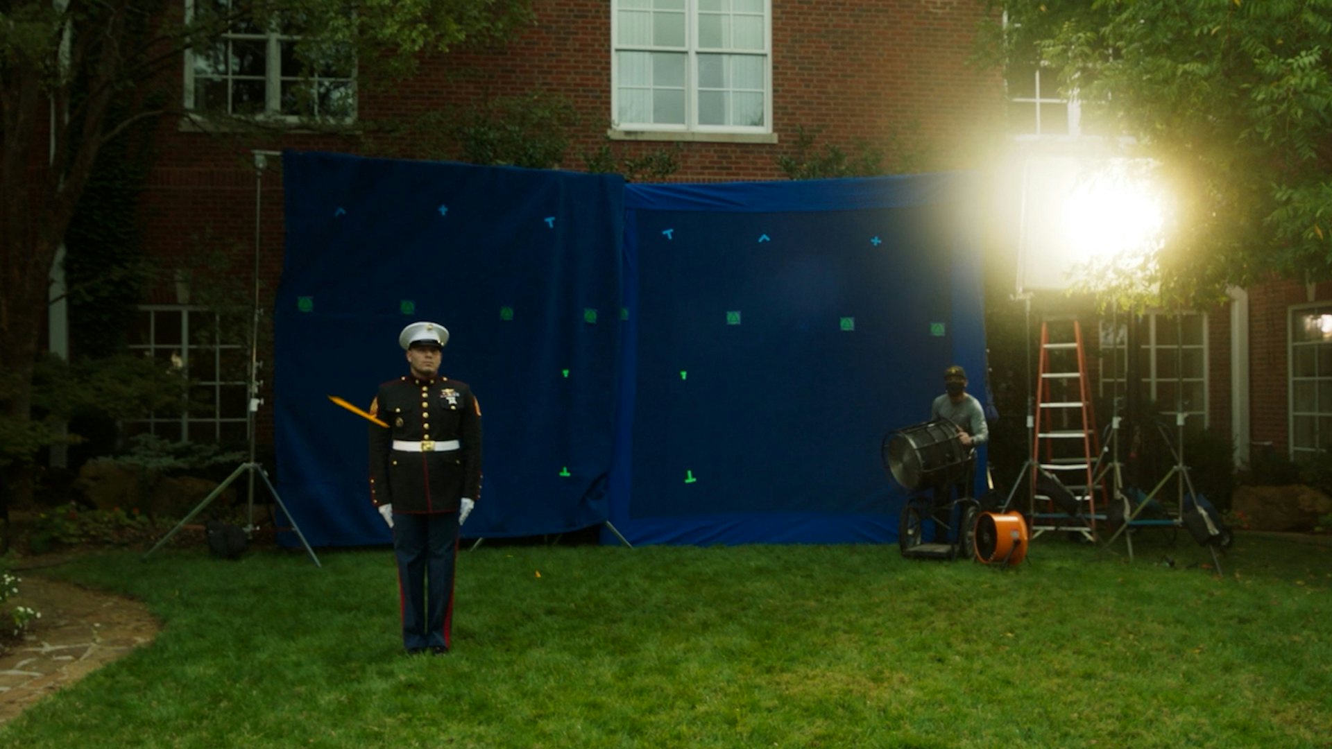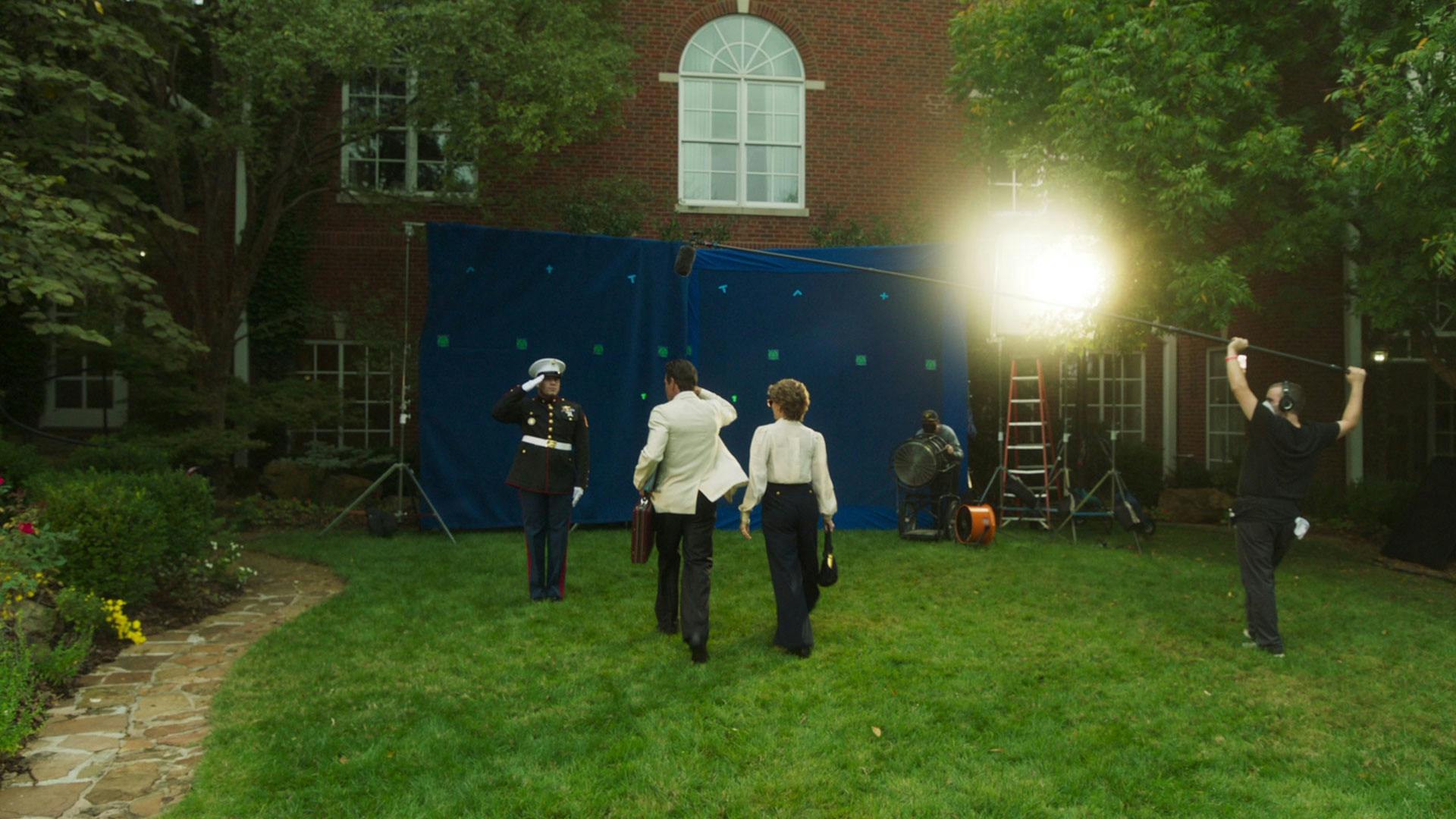 The scenes set around the White House required a detailed reconstruction of both the building and the surrounding vegetation. The lighting department played a pivotal role in recreating an atmosphere perfectly aligned with the natural light on set. Particular attention was given to the reconstruction of the East Room, one of the most significant technical challenges. This iconic press conference room of Ronald Reagan was recreated through a complex 2.5D workflow, combining 3D modeling and matte painting via camera projection. This technique’s precision ensured every historical detail was visually credible, maintaining the original room’s scale and depth.
