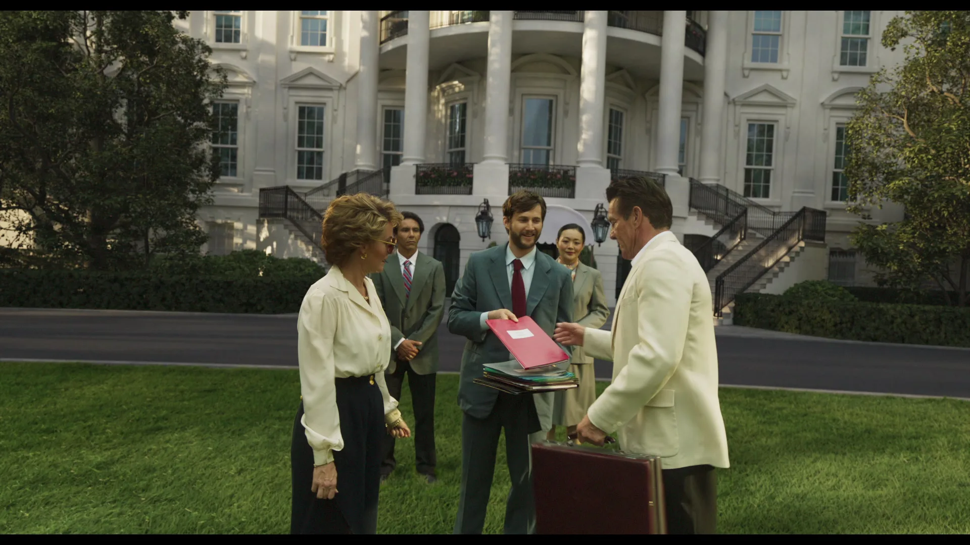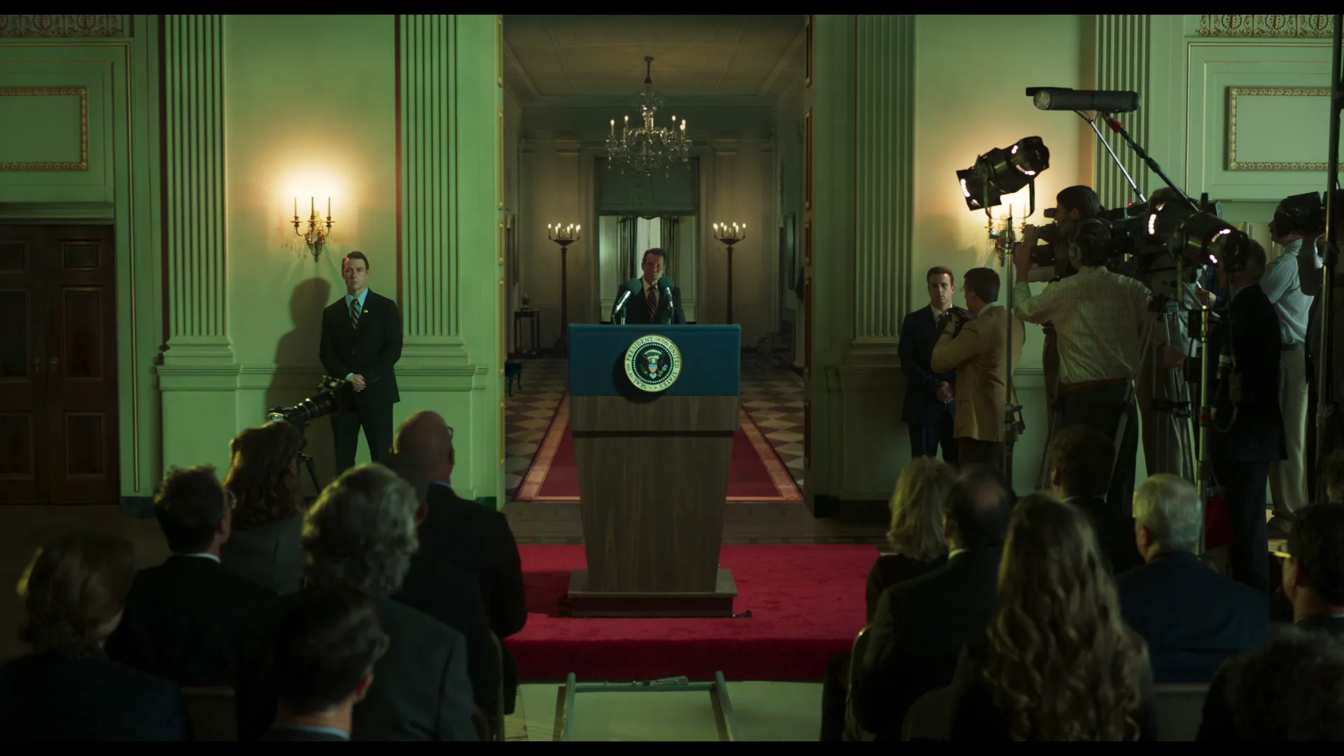 The scenes set around the White House required a detailed reconstruction of both the building and the surrounding vegetation. The lighting department played a pivotal role in recreating an atmosphere perfectly aligned with the natural light on set. Particular attention was given to the reconstruction of the East Room, one of the most significant technical challenges. This iconic press conference room of Ronald Reagan was recreated through a complex 2.5D workflow, combining 3D modeling and matte painting via camera projection. This technique’s precision ensured every historical detail was visually credible, maintaining the original room’s scale and depth.